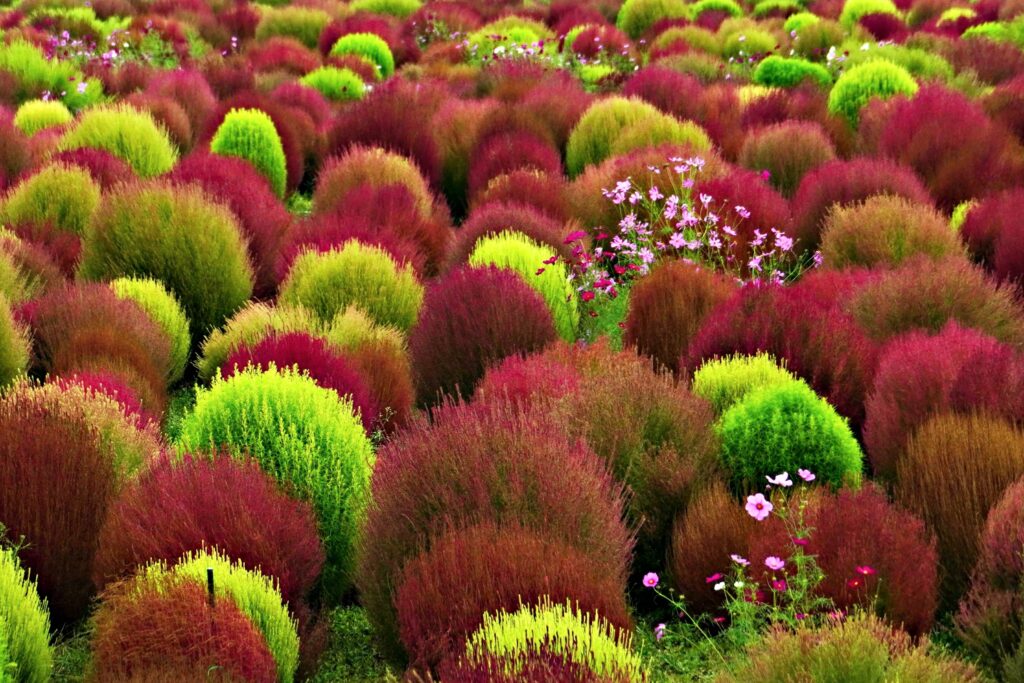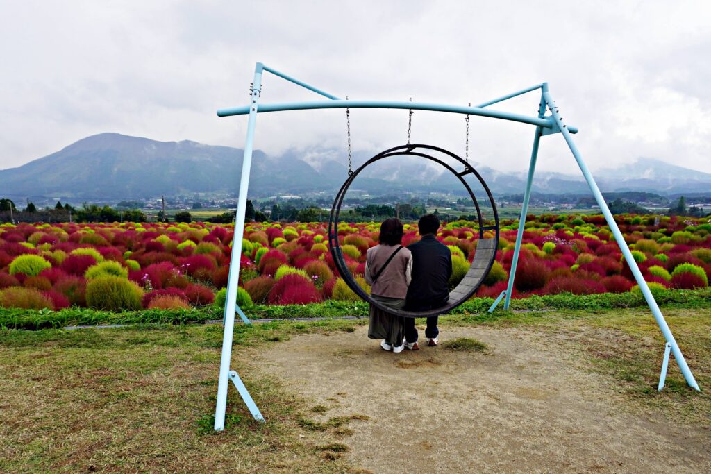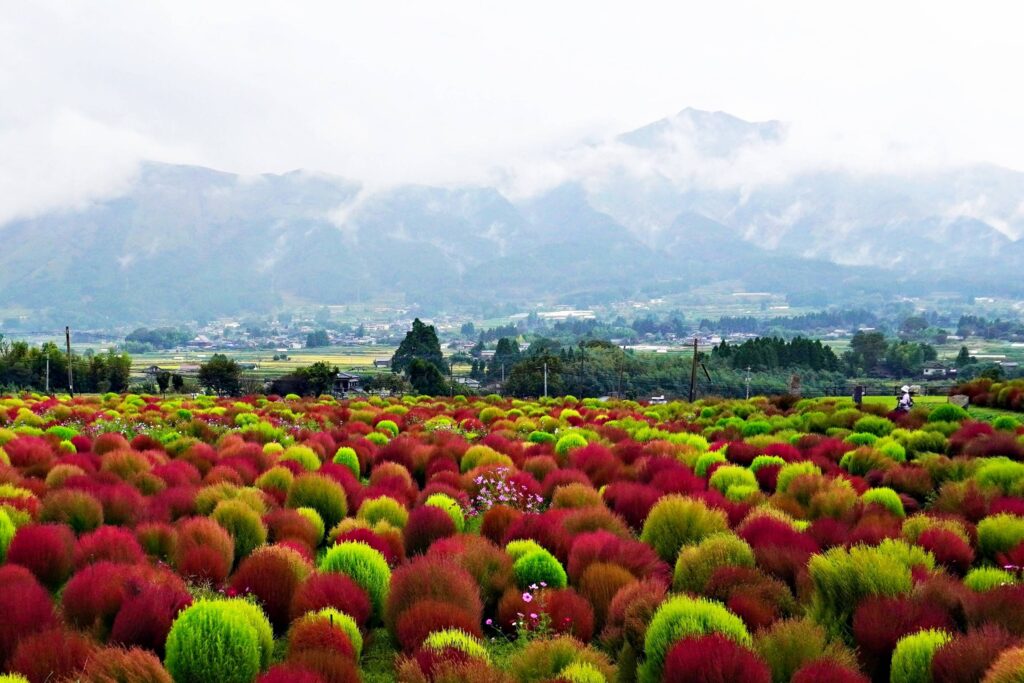 9時に現地集合。講師の武田先生と参加者7名、総勢8名でした。撮影開始時は雨もなく武田先生から遠景の阿蘇の雲の取り込みやコキアの撮影ポイントなどをお聞きしながら各自撮影を始めました。コキアの紅葉はほどよく進み、色合いも鮮やかでした。コキアだけでなく、コキアを見に来られていたご夫婦をモデルに撮らせて頂いたりして撮影しました。撮影を楽しんでいましたが、間もなく小雨が降り始め、本降りになった為、何時もより早く止めました。軒先で集合写真をとり、10時15分に散会しました。他の写真クラブの方々が入れ替わりに来られ、雨の撮影もいいもんだと言われていました。尚、散会後、お一人が約2時間、雨の中を撮影して帰宅したとの事で、視点の違う写真が撮れたのでは?と想像しました。来月の講評会がまた楽しみです。