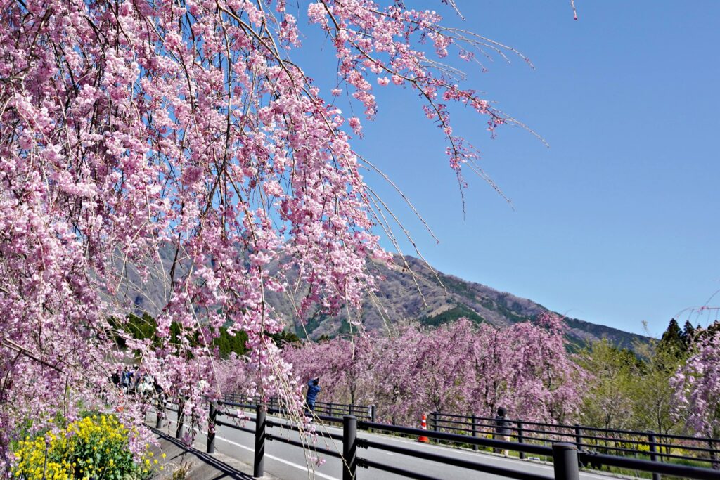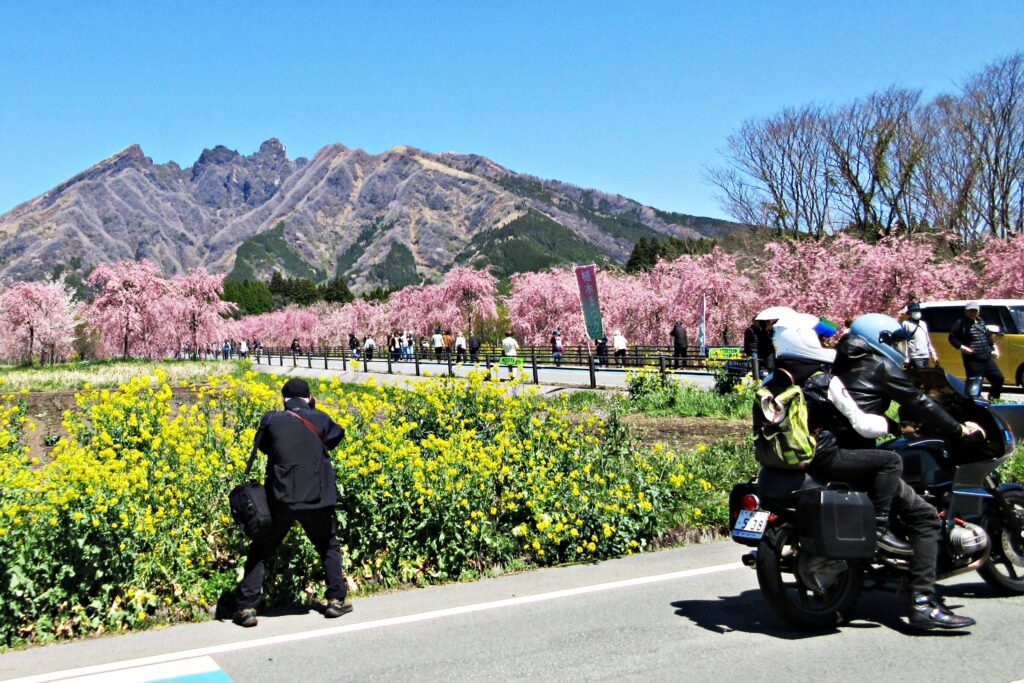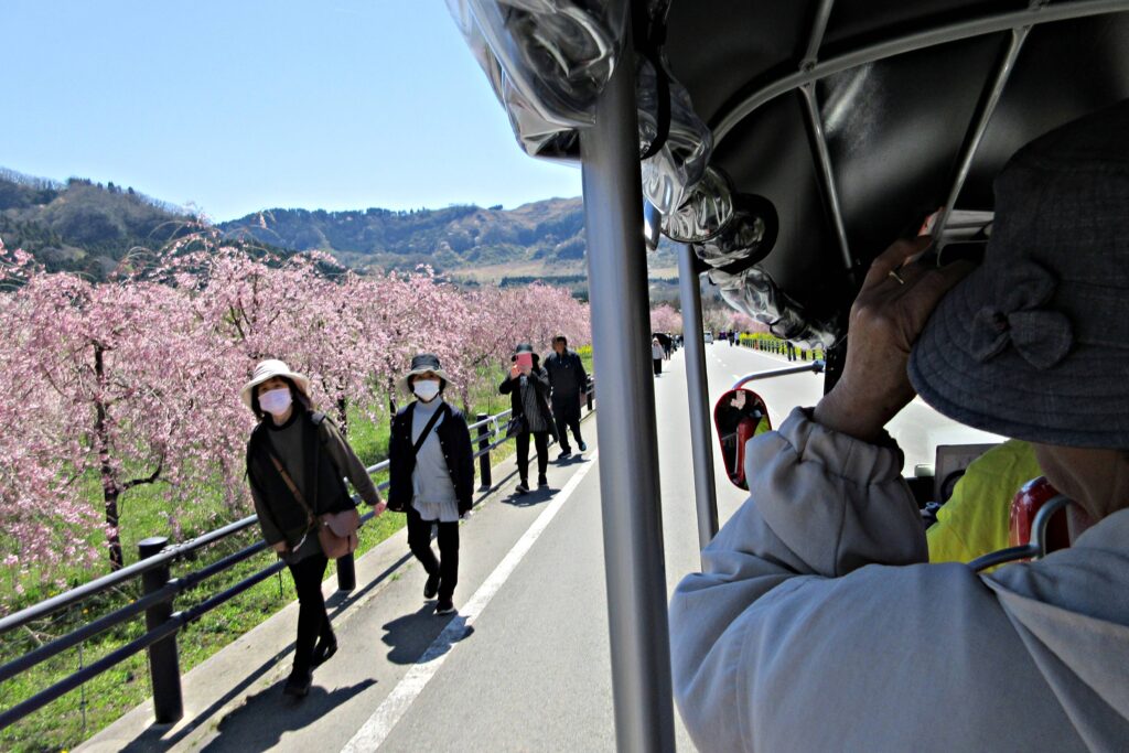 駐車代(1000円)は洒落た領収書でした。記念になりました。駐車場のグラウンドには一番乗り、駐車し無料のシャトルバスでサクラミチの現場へ。シャトルバスはマイクロバスと三輪自動車の二種。三輪自動車に乗りましたが、東南アジアの乗り物を思い出しました。9時40分にはサクラミチに到着。まだ花見観光客は少なく、しだれ桜・菜の花・根子岳を色々な角度から、ゆったりと撮影が出来ました。